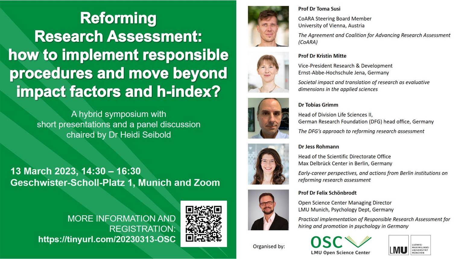 Dear researchers from any disciplines and career stages, research support staff, and research administrators, You, and people from your networks, are invited to attend and contribute to the discussions of this hybrid symposium: Reforming Research Assessment: how to implement responsible procedures and move beyond impact factors and h-index? Geschwister-Scholl-Platz 1, Munich, and on Zoom, on March 13, 14:30 - 16:30 st. Registration: https://en.xing-events.com/AUCGBGM.html "The use of journal impact factors and other metric indicators of research productivity, such as the h-index, has been heavily criticised for being invalid for the assessment of individual researchers and for fueling a detrimental "publish or perish" culture. Multiple initiatives call for developing alternatives to existing metrics that better reflect quality (instead of quantity) in research assessment." (https://doi.org/10.23668/psycharchives.8162) A number of themes run through the recommendations of initiatives such as The Declaration on Research Assessment (DORA, https://sfdora.org/) and the Coalition for Advancing Research Assessment (CoARA, https://coara.eu/): * the need to eliminate the use of journal-based metrics, such as Journal Impact Factors, in funding, appointment, and promotion considerations; * the need to assess research on its own merits rather than on the basis of the journal in which the research is published; and * the need to recognise the diverse outputs, practices, and activities that maximise the quality and impact of research As of 12 January 2023, 441 organisations (including European Commission, League of European Research Universities, European University Association, Science Europe, Deutsche Forschungsgemeinschaft (DFG) e.V., Deutsche Gesellschaft für Psychologie) have signed the Agreement on Reforming Research Assessment. The signatories agree to define an action plan within the year. With these developments, it is evident that profound changes will come in how academic achievements will be evaluated, both in hiring and in funding decisions. But how can we practically implement and evaluate a reformed research assessment? What will be the consequences for researchers from signing institutions or applying for signatory funding agencies? How to ensure a smooth transition for early-career researchers? And how can we reconcile diverse needs across disciplines? To address these questions, the LMU Open Science Center is inviting you to a symposium, with short presentations followed by a panel discussion. * Prof Dr Toma Susi (CoARA Steering Board Member, University of Vienna) will present the Agreement and the Coalition for Advancing Research Assessment (https://coara.eu/agreement/the-agreement-full-text/). * Prof Dr Kristin Mitte (Vice President Research & Development, Ernst-Abbe-Hochschule Jena) will share her views on how societal impact and translation of research constitute important evaluative dimensions in the applied sciences. * Dr Tobias Grimm (Head of Division Life Sciences II, German Research Foundation (DFG) head office) will present the DFG's approach to reforming research assessment. * Dr Jess Rohmann (Head of the Scientific Directorate Office at the Max Delbrück Center in Berlin) will present the perspective of Early-Career Researchers and a history of actions taken in Berlin Institutions (Berlin Institute of Health, Max Delbrück Center). * Prof Dr Felix Schönbrodt (Managing Director of the LMU Open Science Center) will present the Deutsche Gesellschaft für Psychologie's working group proposal for practical implementation, for the field of psychology in Germany (see https://doi.org/10.23668/psycharchives.8162 and https://doi.org/10.31234/osf.io/5yexm). The event will be chaired by Dr Heidi Seibold, Open and Reproducible Data Science Consultant, and Associate Member of the LMU Open Science Center. Registration: https://en.xing-events.com/AUCGBGM.html Please circulate in your networks, and share on LinkedIn<https://www.linkedin.com/posts/lmu-open-science-center_symposium-reforming-r...>, Twitter<https://twitter.com/lmu_osc/status/1620798381009571840>, Mastodon<https://scicomm.xyz/@lmu_osc/109790191822470536>. Best wishes Dr Malika Ihle, LMU Open Science Center coordinator Join the LMU Open Science Center community and attend our workshops and meetups (see event list here: https://www.osc.uni-muenchen.de/events/index.html) by subscribing to our mailing list: https://lists.lrz.de/mailman/listinfo/lmu-osc. As an LMU affiliate, you can also contribute to our activities by becoming a member https://www.osc.uni-muenchen.de/members/join/index.html. Visit our website https://www.osc.uni-muenchen.de/index.html for more information! [cid:image003.jpg@01D93660.B86753C0] -- Dr. Malika Ihle (she/her) (pronounciation<https://namedrop.io/malikaihle>) LMU Open Science Center Coordinator @MalikaIhle<https://twitter.com/MalikaIhle> | @MalikaIhle@scicomm.xyz<https://scicomm.xyz/web/@MalikaIhle> www.osc.lmu.de<http://www.osc.lmu.de/> | @lmu_osc<mailto:@lmu_osc> |@lmu_osc@scicomm.xyz<https://scicomm.xyz/web/@lmu_osc> https://www.linkedin.com/company/lmu-open-science-center Newsletter sign-up: https://lists.lrz.de/mailman/listinfo/lmu-osc
