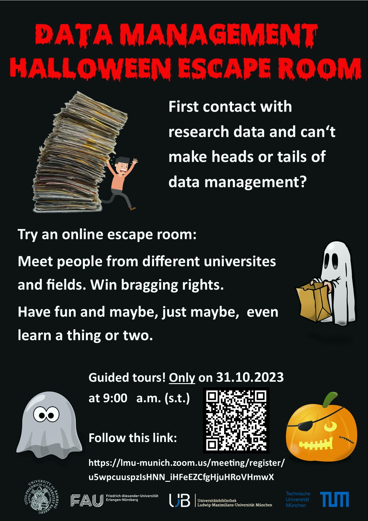 Greetings! Are you interested in unsolved mysteries? Do you like collaborative games and escape rooms? And you may or may not have heard of something called (Research) Data Management? Then you should try the "Data (Horror) Escape Room", developed by VU Amsterdam, Eindhoven University of Technology and Leiden University. We invite you to an online event where you have the once-in-a-lifetime opportunity to meet fellow students from FAU, Uni Bamberg, LMU and TUM to work together in teams to find your way through the scary world of data management and - as a benefit - learn many useful things that will make your university life easier. * What's to be won: Fame, glory and bragging rights. * What's there to lose: Fear of Data Management. Join us on Halloween (31.10.) at 9:00 am sharp in Zoom! You can register here: https://lmu-munich.zoom.us/meeting/register/u5wpcuuspzIsHNN_iHFeEZCfgHjuHRoV... For questions, contact: rdm@ub.uni-muenchen.de<mailto:rdm@ub.uni-muenchen.de> The information can be passed on to everyone interested, especially student groups and doctoral programs. Cheers, Martin -- Dr. Martin Spenger Referent für Forschungsdatenmanagement Ludwig-Maximilians-Universität München Universitätsbibliothek Abteilung Digitale Dienste Geschwister-Scholl-Platz 1, 80359 München Tel.: +49 (0) 89 / 2180 - 5916 E-Mail: Martin.Spenger@ub.uni-muenchen.de<mailto:Martin.Spenger@ub.uni-muenchen.de> www.ub.uni-muenchen.de<http://www.ub.uni-muenchen.de/>